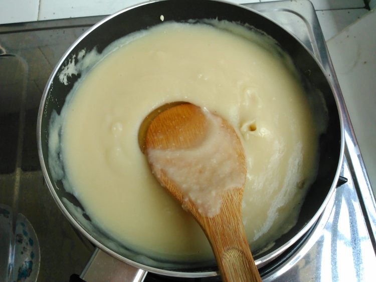 11.将45g砂糖和20g水混合,用小火煮沸。加入炒过的豆蓉。