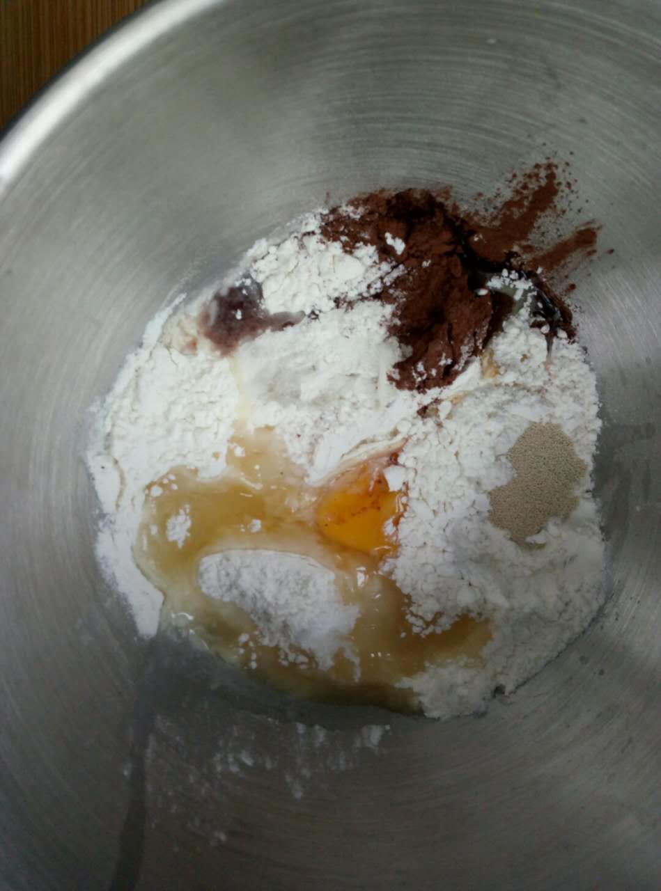 材料:全麦粉:250g;水:145g;咖啡粉:10g;可可粉:5g;细砂糖:30g;酵母:3g;盐:2g;黄油:20g;熟核桃仁:适量;葡萄干:适量;高筋面粉10g;